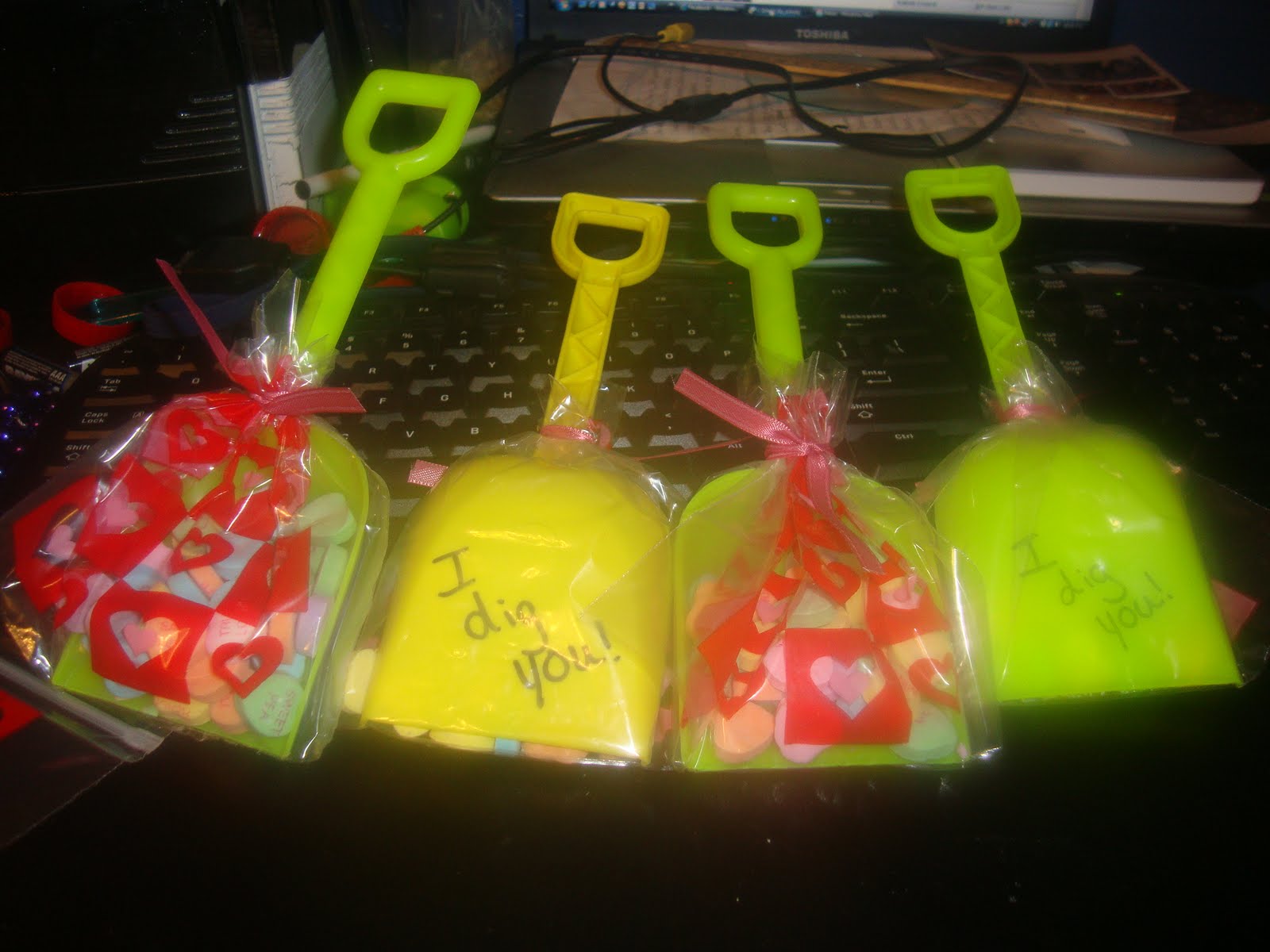 All their goodies. My son is homeschooled this year. I told him that he would get a better V-day bucket than had he gone to school. Oh and the explanation for the buckets. I needed the shovels for one of the items and this was the only way. I hadn't figured out what I was going to put the goodies in, so this worked perfectly.
